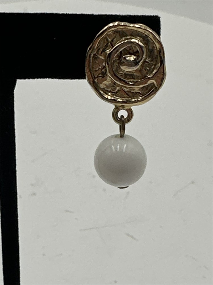 A pair of gold-tone coin-shaped earrings, with a decorative swirl pattern and a white glass bead dangle. Post-back closure. Good condition.