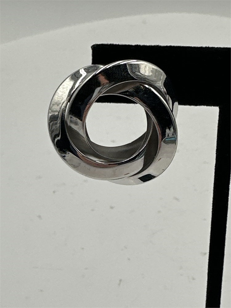 A pair of vintage modernist silver-tone earrings, from the 1970s/1980s. They feature a 3D, three-dimensional double circle or "love knot" style with a post-back closure for pierced ears. Good condition.