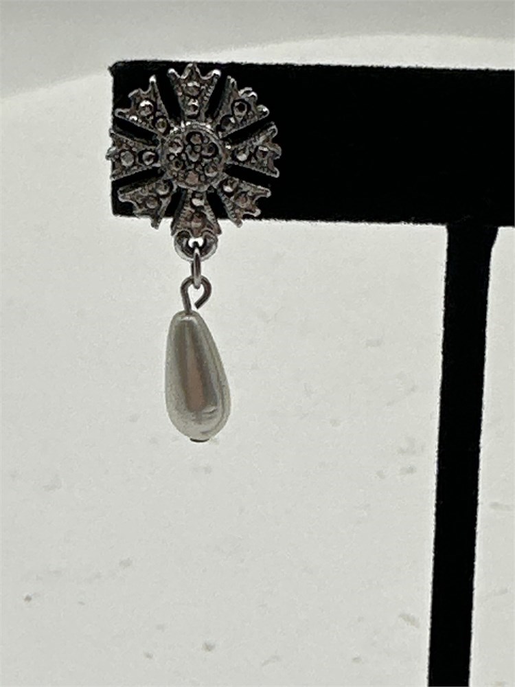 A pair of vintage-style post dangle earrings, featuring a filigree starburst or sunburst design and faux elongated pearl teardrop drops. The earrings are made from silver-toned metal and accented with marcasite. Good condition.