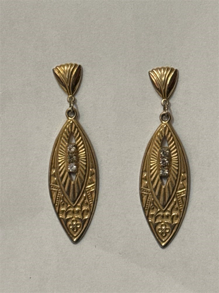 A pair of bronze-toned dangle earrings featuring an intricate, etched marquise-shaped drop. The earrings reflect Victorian Revival or Art Deco aesthetics, characterized by geometric patterns and ornate raised relief. Each drop includes a central openwork section, etched fan-like details, and is typically accented with rhinestones or glass crystals. Post setting at back-please note earring backs not included. Length 2 inches. Good condition.