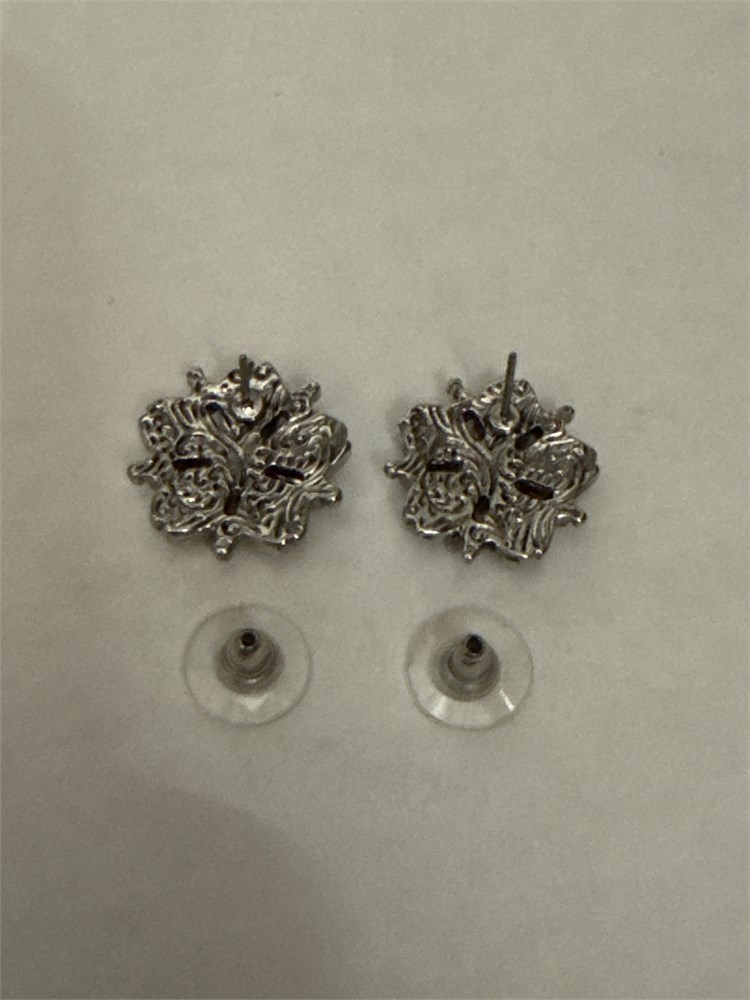 A pair of floral shaped red crystal stud earrings with rhinestone accents. Posts at back. Length 1 inch Good condition.