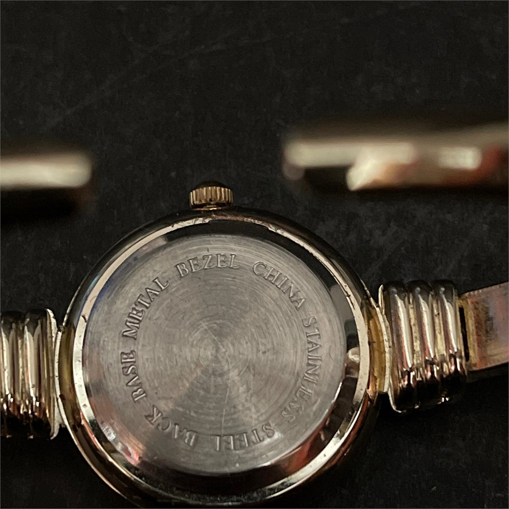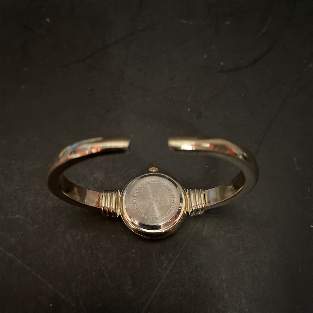 Unbranded women's quartz bangle watch with a gold-tone base metal bezel and stainless steel caseback, manufactured in China. The dial features a glitter snowflake motif with Arabic numeral indices; the case back is stamped "BASE METAL BEZEL CHINA STAINLESS STEEL BACK" with no brand, serial number, or date code present. The gold-tone plating shows wear and brassing, and the dial exhibits discoloration consistent with past moisture ingress.