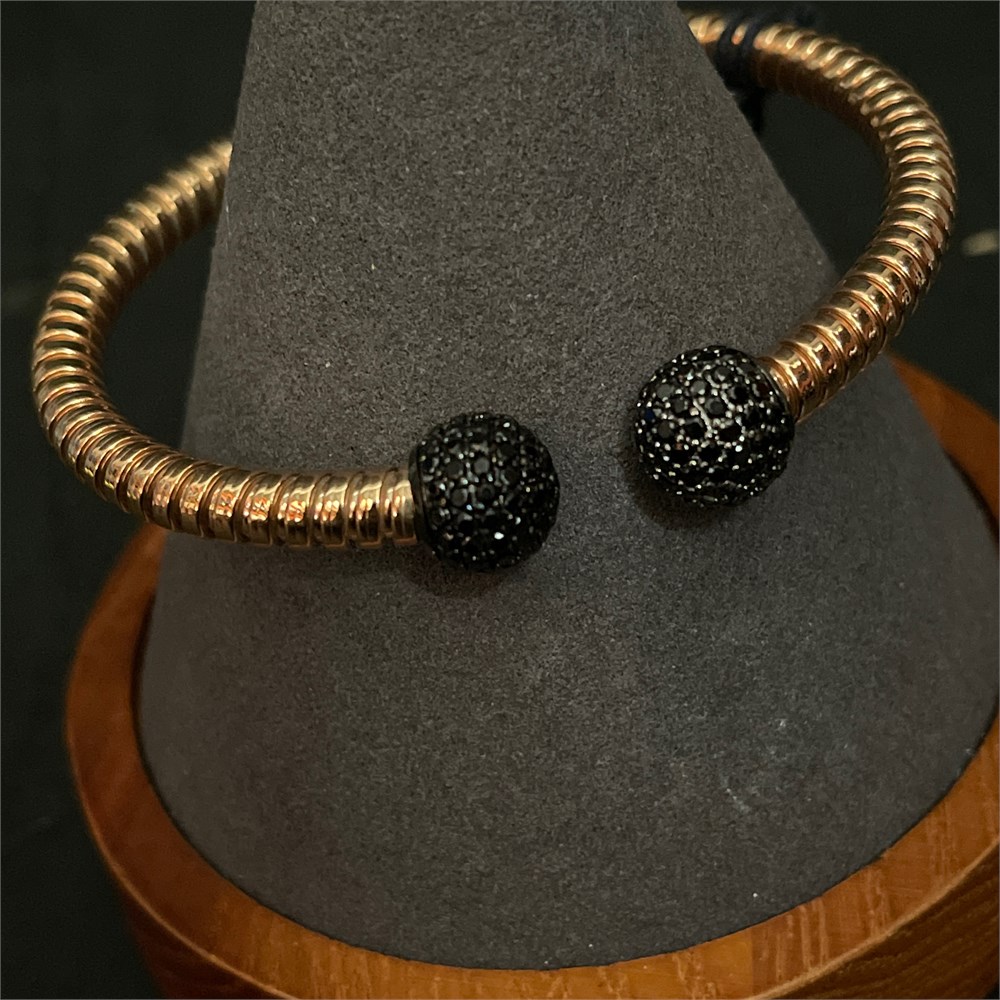 Flexible open cuff bypass bracelet manufactured in Italy by Milor for QVC's "Bronzo Italia" collection, constructed of solid rose-tone bronze in a coiled tubogas style with two spherical finials pavé-set with black Diamonique (cubic zirconia) stones. Original brand hang tag reading "MILOR · ITALY" and material tag reading "BRONZE / MILOR / ITALY" are still attached, confirming new-with-tags condition. A contemporary production piece from the 21st century.