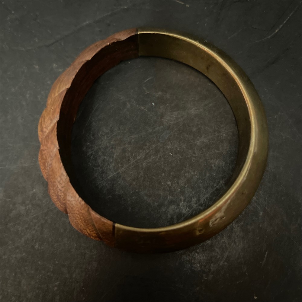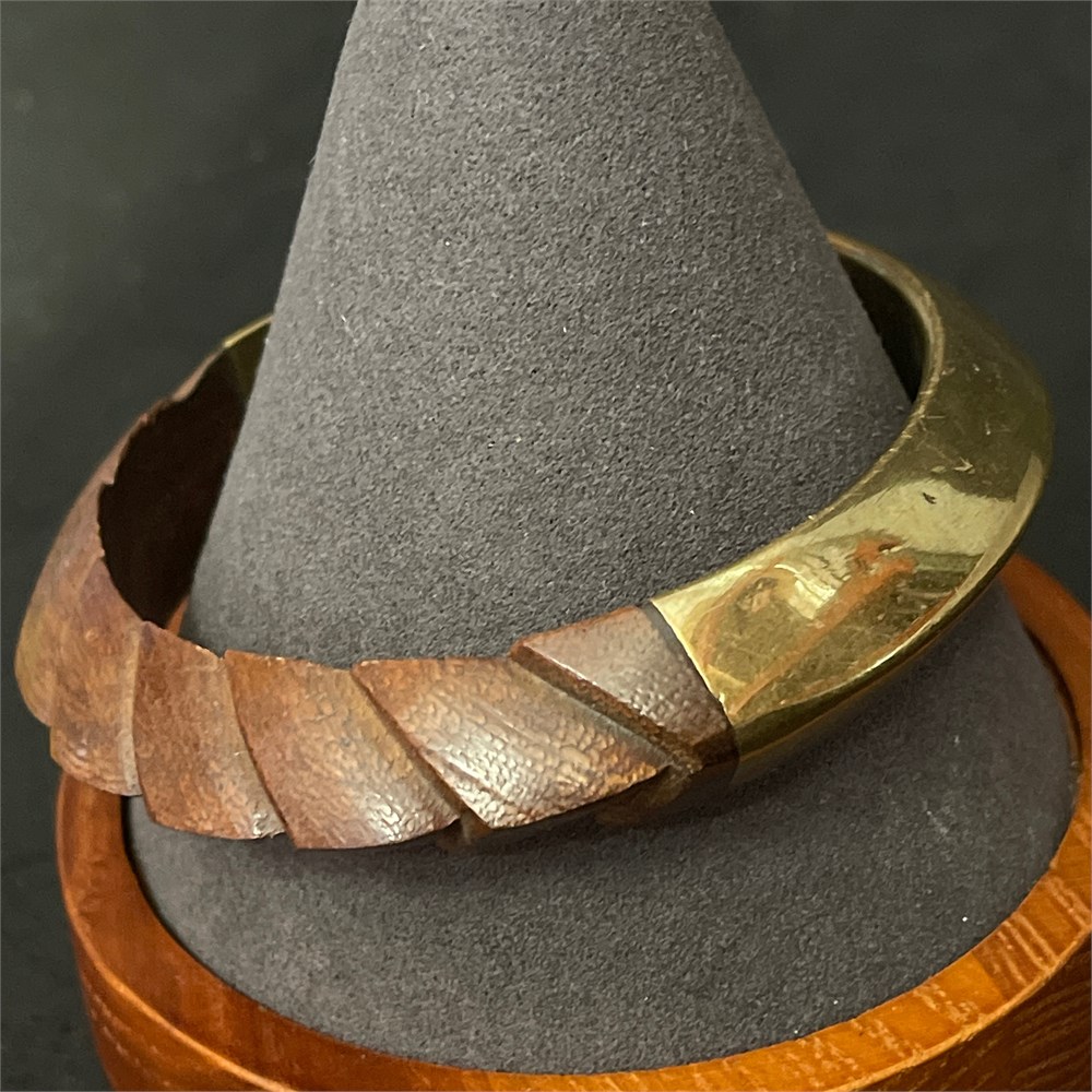 Unsigned Modernist Mixed-Media Bangle Bracelet in Carved Wood and Brass View Watchlist >