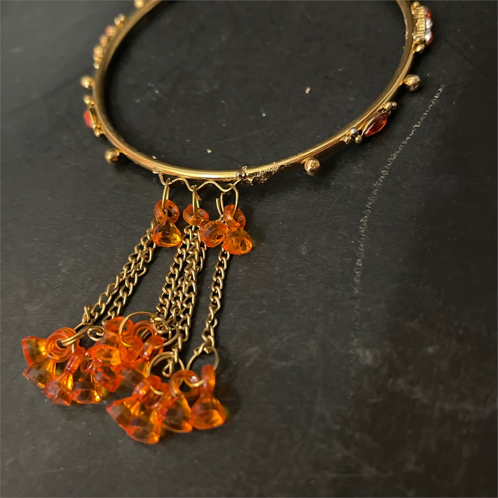 Costume jewelry bangle in gilt base metal with cascading chain tassels terminated by faceted orange plastic or glass bell-shaped beads. Construction features simple wire pins, cable chain links, and un-soldered jump rings consistent with mass-produced fashion jewelry of the late 20th century. Notable plating loss and base metal pitting along the band; no maker's marks or hallmarks present.