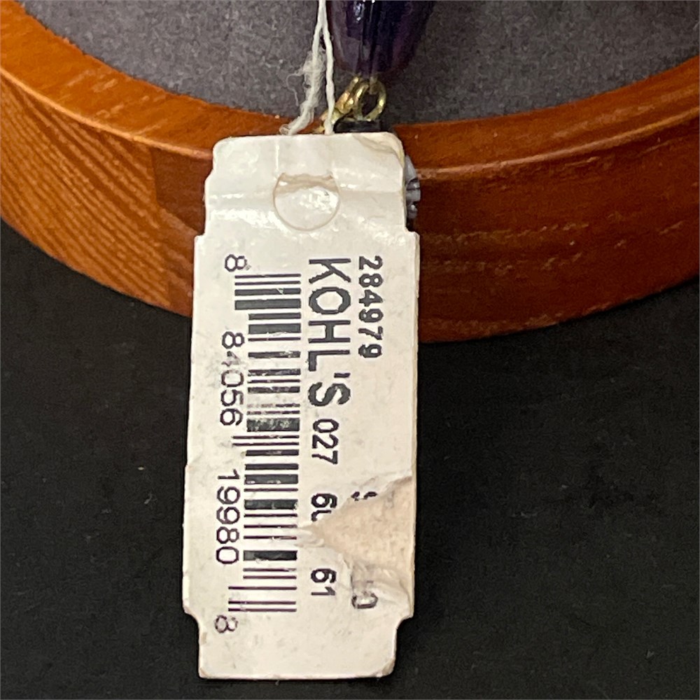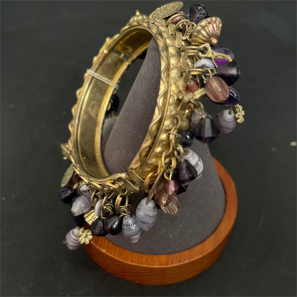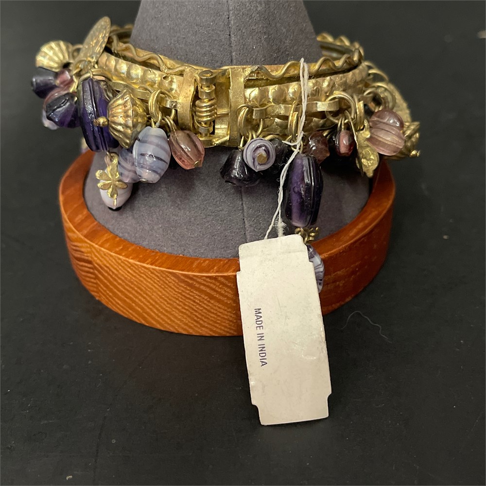 Gold-tone base metal stacked bangle bracelet with dangling glass and acrylic beads in purple and lavender tones, interspersed with cast metal charms including a faux Ottoman Tughra coin and flower motifs. Retailed by Kohl's (Department 027, SKU 284979); made in India of brass-alloy with antiqued wash finish, characteristic of Indian export costume jewelry from this period. Original retail tag present with partial pricing visible.