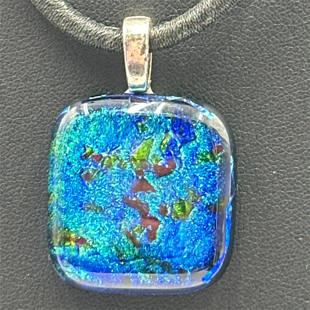 Handcrafted dichroic fused glass pendant featuring a silver-tone bail, suspended on a black cord. The pendant is kiln-formed from layered dichroic glass, a material produced by depositing thin metallic oxide films onto glass to create shifting iridescent color effects. Contemporary studio glass jewelry piece.