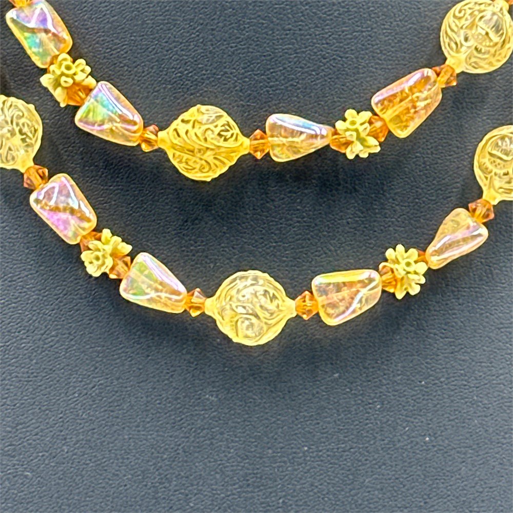 Double-strand necklace composed of Aurora Borealis-finished molded glass beads in amber/gold tones, interspersed with gold-tone metal floral spacer beads and faceted crystal accents. The pressed glass beads feature embossed scroll and floral motifs consistent with mid-20th century Czech or West German glass bead production.