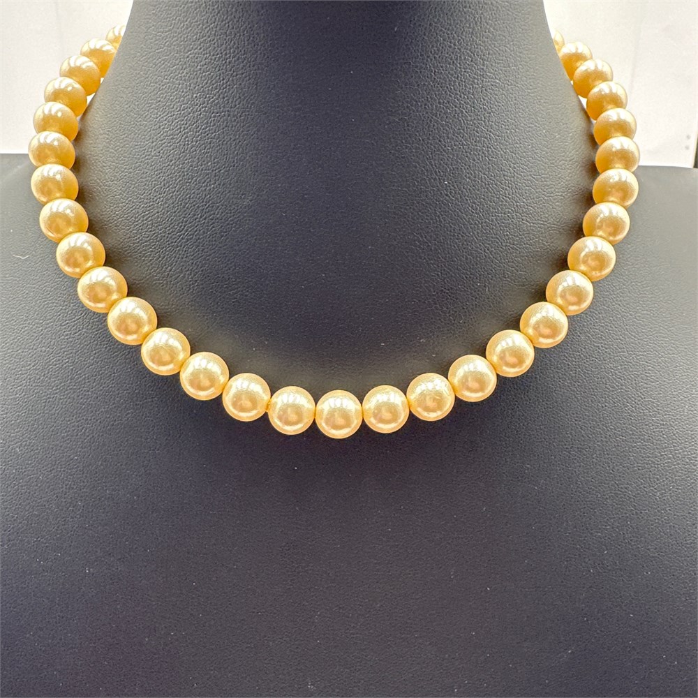 Single-strand cultured pearl necklace featuring individually knotted pearls with a cream to golden overtone, consistent with Akoya or South Sea cultivation. Pearls appear to measure approximately 8-9mm each, strung on silk cord in a choker/princess length configuration. Clasp type not visible from available images.