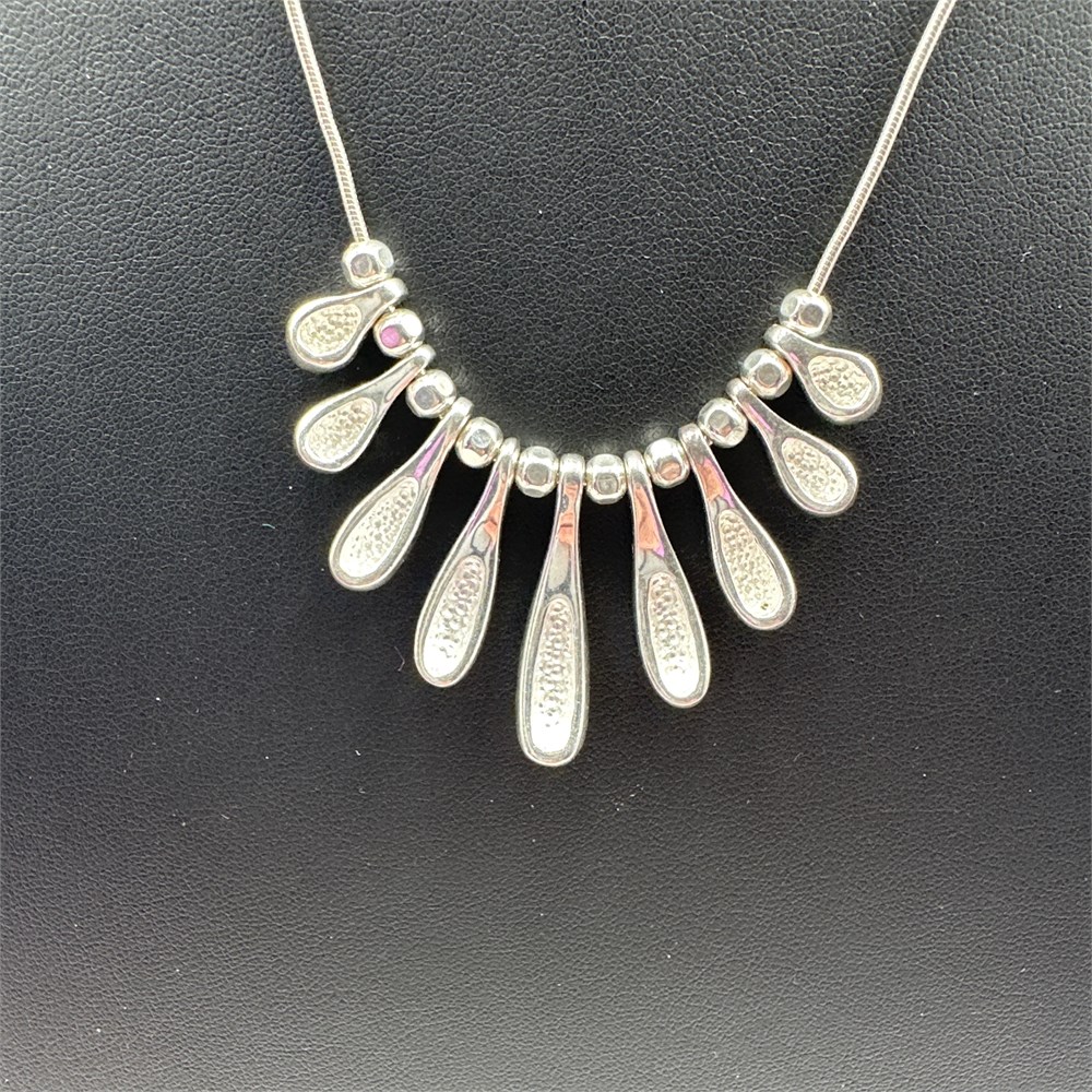 Designed by American modernist jeweler Robert Lee Morris for his RLM Studio line, originally retailed through QVC. The hang-tag is stamped "RLM STUDIO," with the reverse typically bearing a 925 purity mark. Sterling silver construction on a snake chain with graduated stippled teardrop pendants separated by round spacer beads.