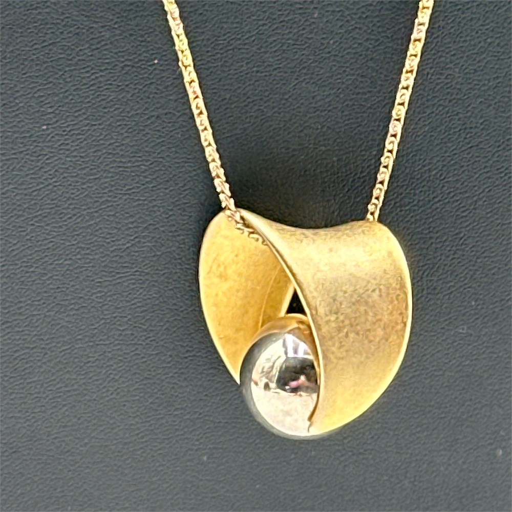Long gold-tone box chain necklace featuring a modernist sculptural pendant with a brushed satin finish and a dark spherical bead accent. The abstract twisted form and matte finish are consistent with mid-to-late 20th century modernist jewelry design.