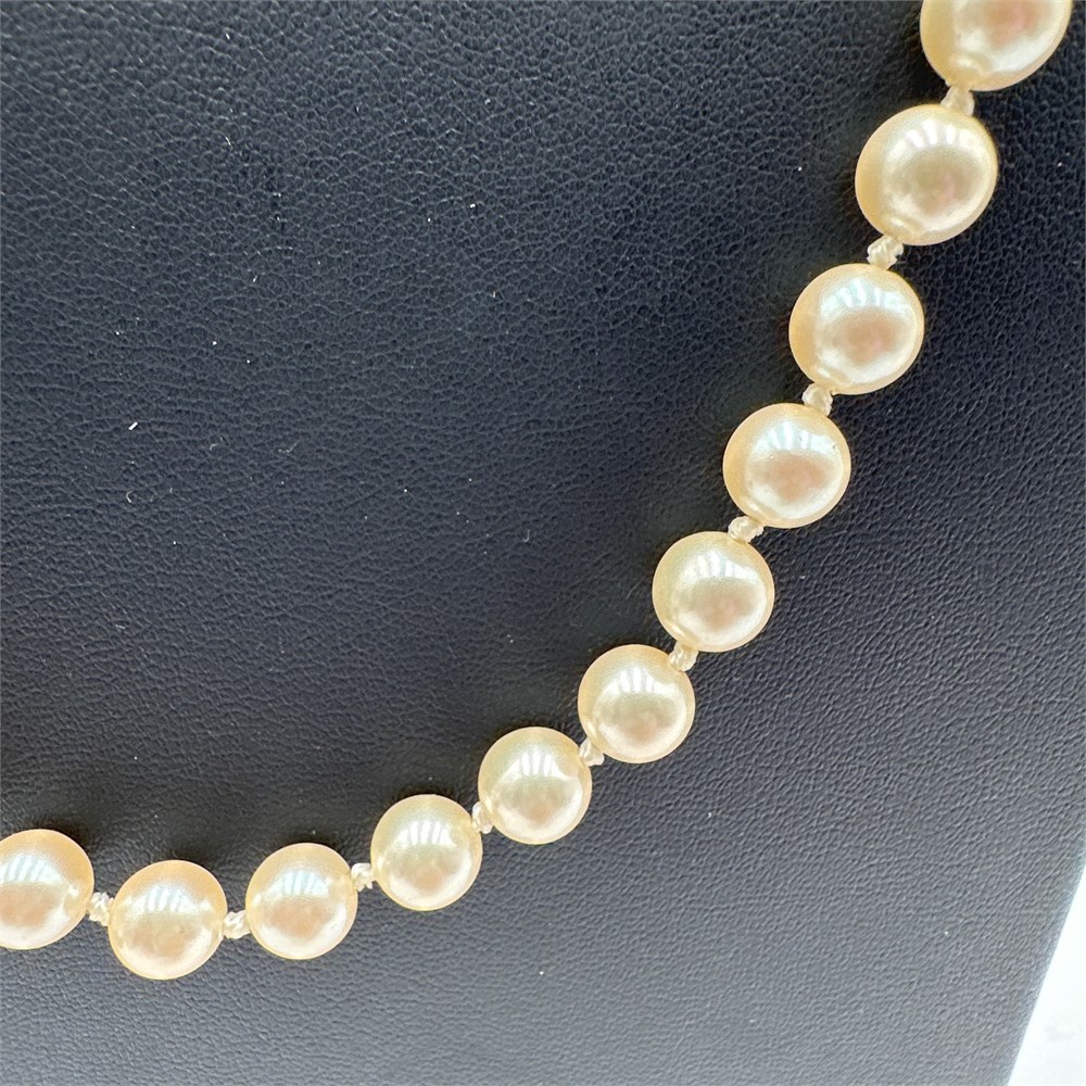 Single-strand cultured pearl necklace featuring individually knotted pearls with a cream to ivory body color and good luster. Pearls appear to measure approximately 7-7.5mm in diameter; the strand is opera length, approximately 28-30 inches, and is hand-knotted between each pearl for security.