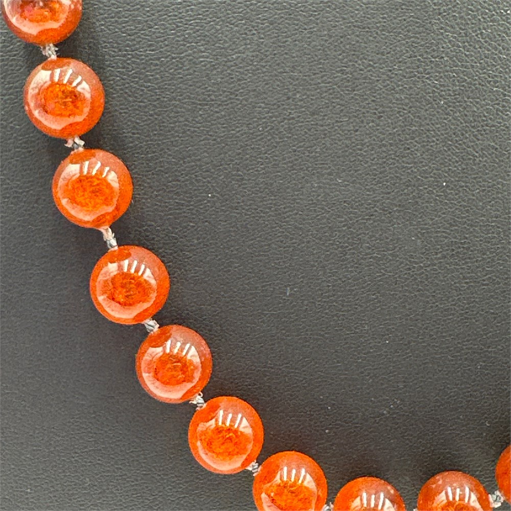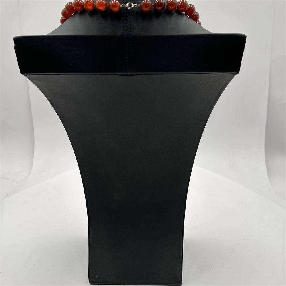 Necklace composed of individually hand-knotted polished natural amber round beads. The beads exhibit characteristic internal inclusions and natural color variation consistent with genuine Baltic amber.
