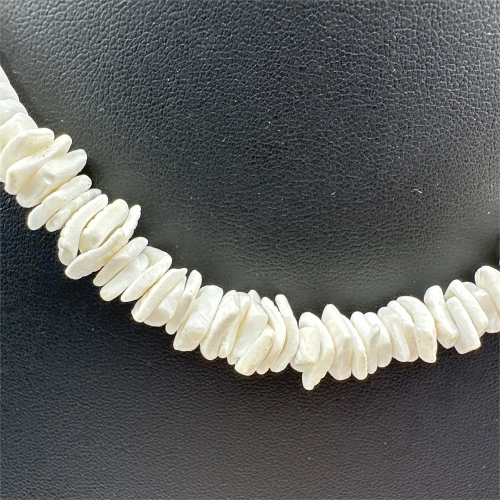 Necklace composed of natural puka shell chips, graduated in size with larger pieces at the center. The shells are strung on cord in a traditional Hawaiian-style configuration, likely dating from the late 20th century.