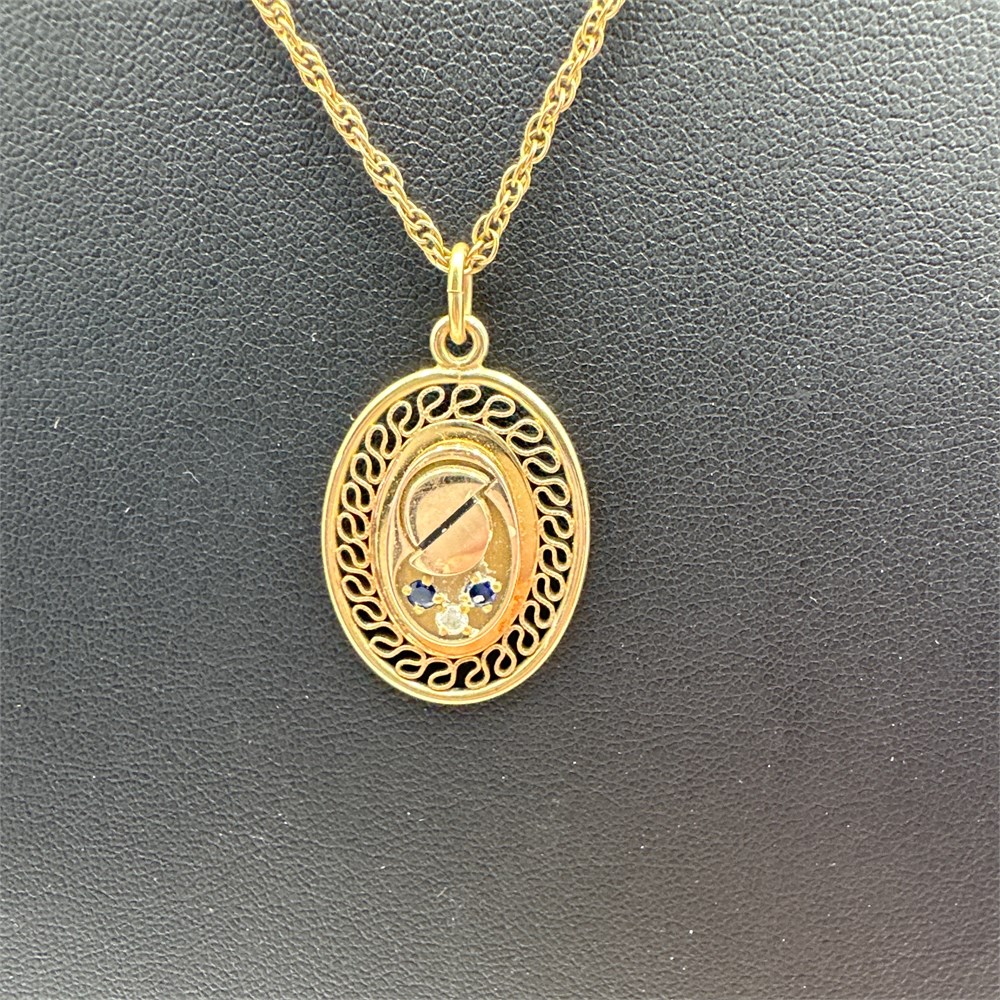 Gold-filled oval pendant featuring filigree scrollwork border and a central floral motif, suspended on a rope-style chain. The construction and design elements are consistent with late 19th to early 20th century Victorian-era jewelry craftsmanship.