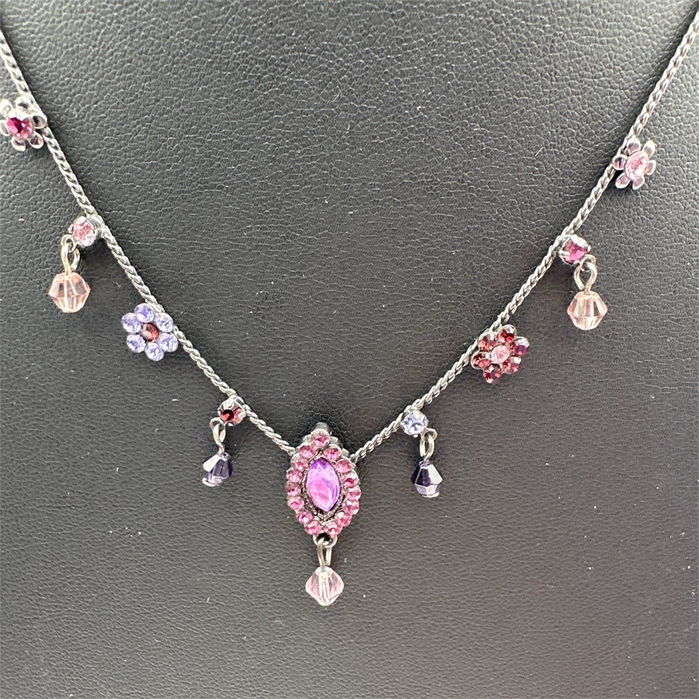 Crystal and Rhinestone Floral Charm Necklace with Purple Stones on Gunmetal View Watchlist >
