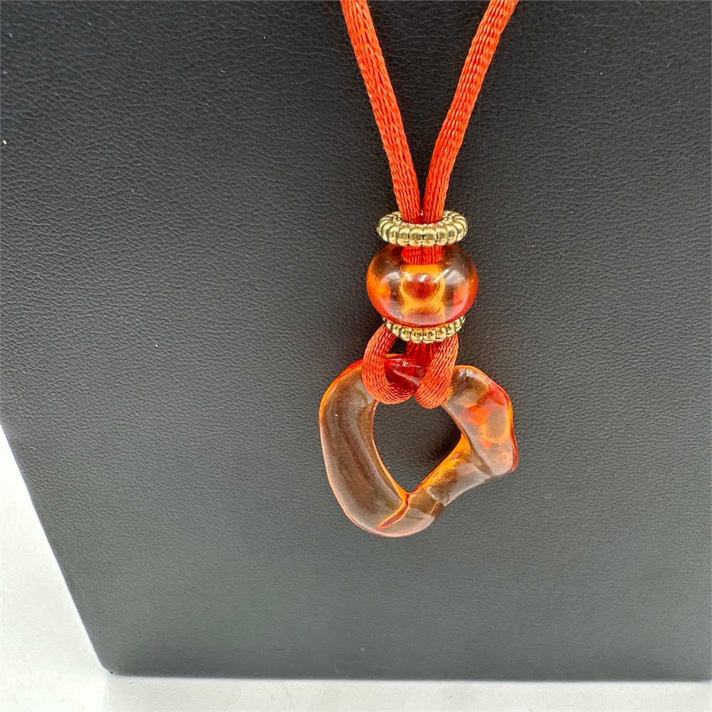 Pendant necklace featuring a handmade lampwork art glass pendant in amber and brown tones, accented with glass bead and seed bead details, strung on a double-strand silk cord. The pendant appears to be a stylized open heart or hook form in translucent art glass with tortoiseshell-like coloring.