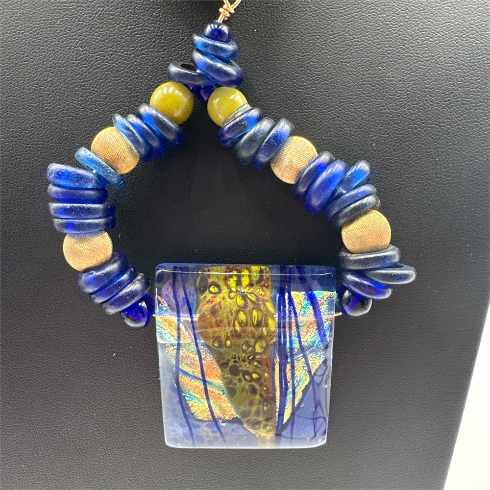 Art Glass Pendant Necklace with Dichroic Glass, Lapis Lazuli Beads, and Silk View Watchlist >