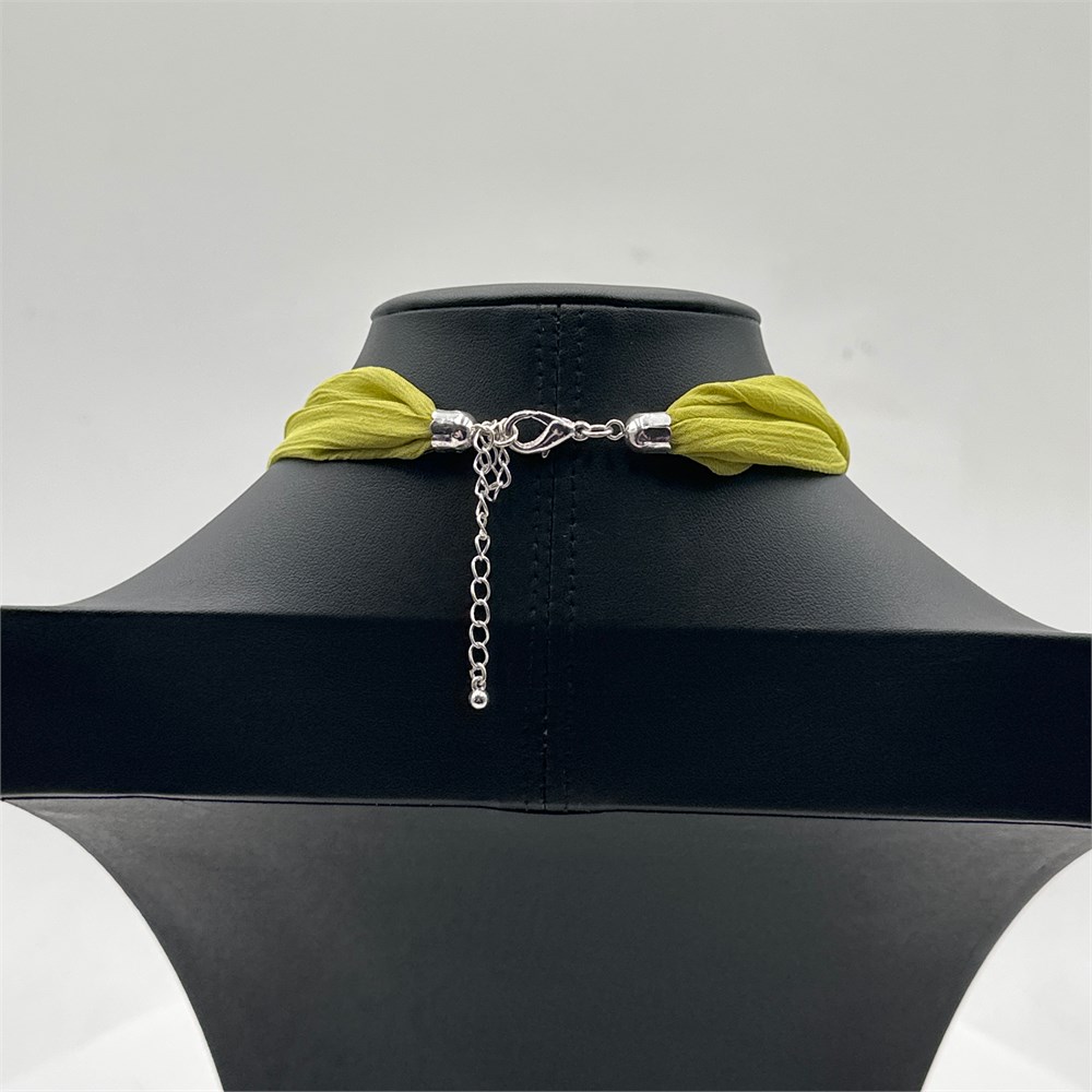 Artisan-crafted pendant necklace featuring a square dichroic art glass focal piece with iridescent foil inclusions, accented by lapis lazuli disc beads and brushed gold-tone metal spacers. The pendant is suspended from a chartreuse silk ribbon cord with wire-wrapped bail construction.