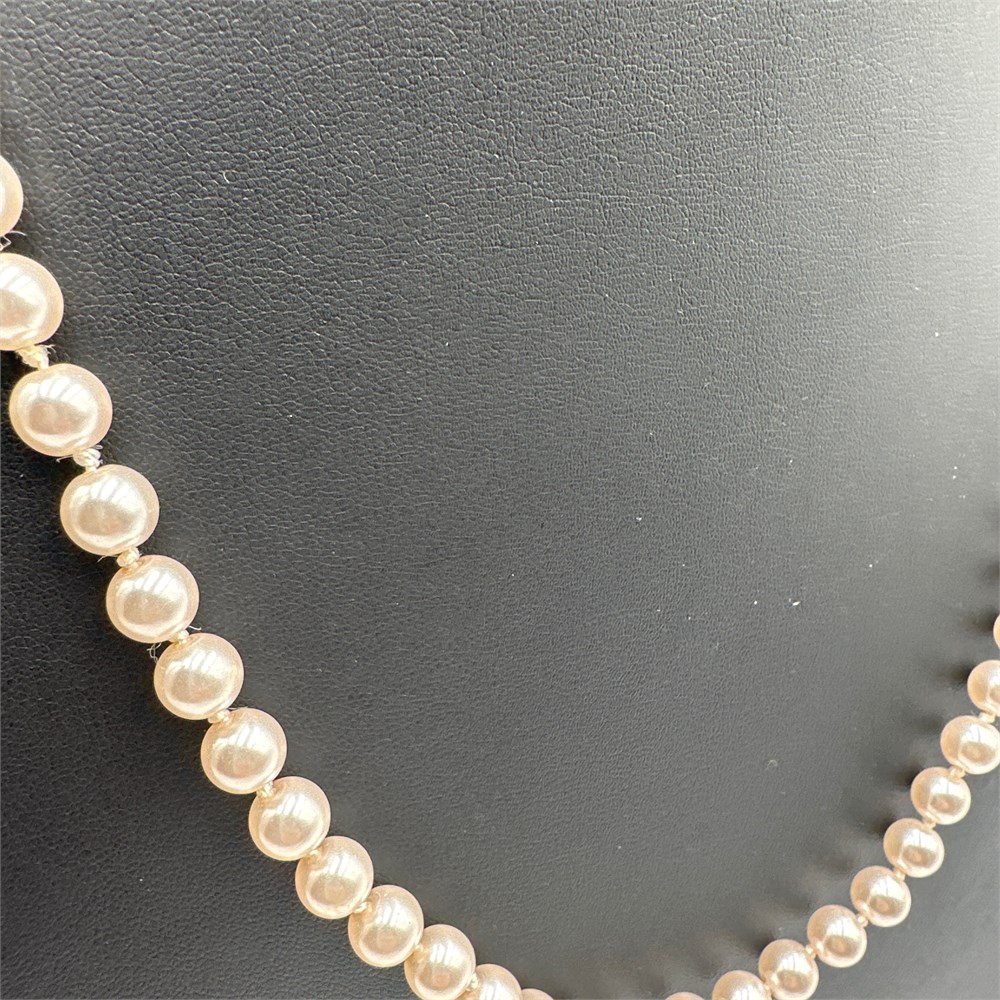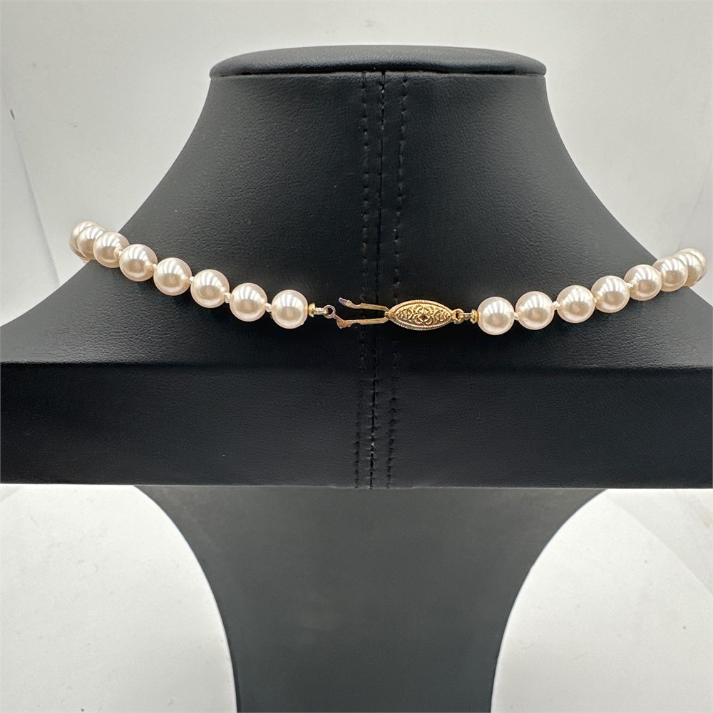 Single-strand necklace of uniform round pearls, individually hand-knotted on thread, finished with a gold-tone oval filigree fishhook clasp consistent with mid-20th century production. Pearl authenticity (cultured vs. simulated) cannot be confirmed without physical testing; no maker's marks, purity stamps, or hallmarks are visible on the clasp. The knotting and clasp style are characteristic of both fine cultured and high-quality faux pearl strands from the period.