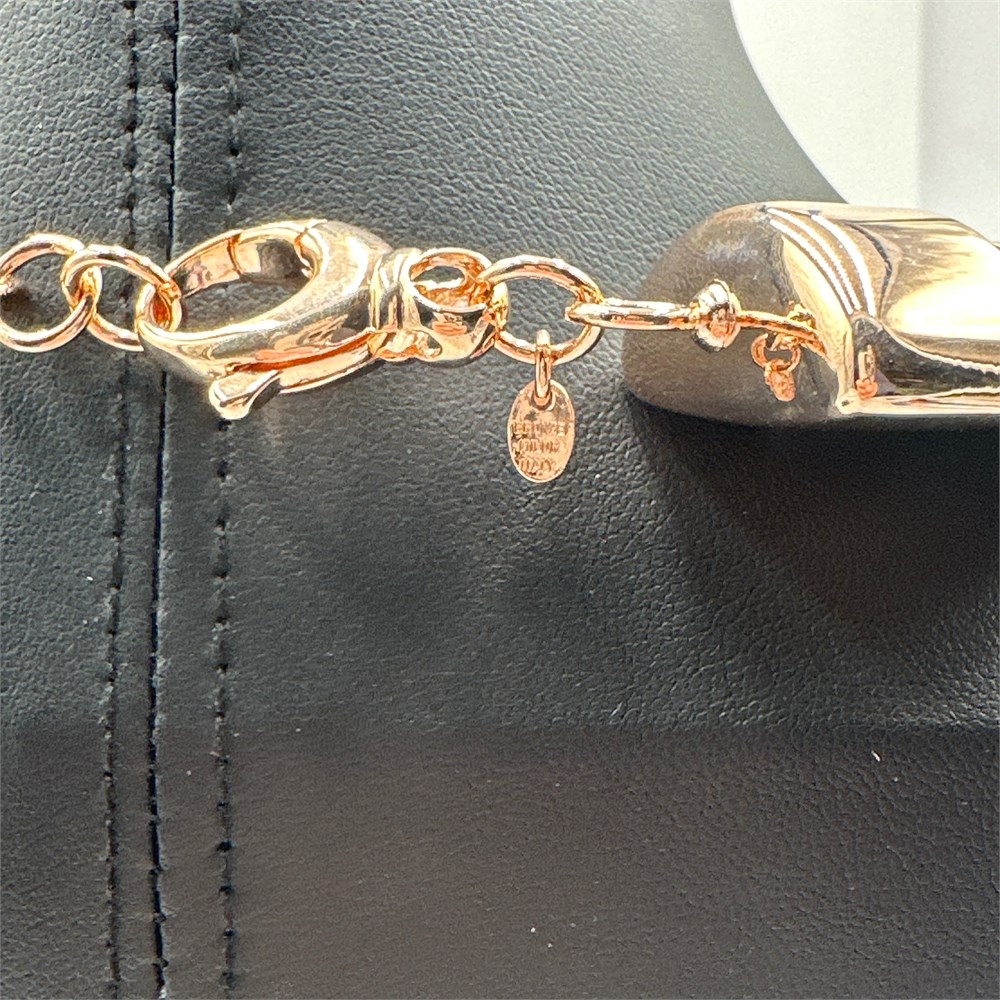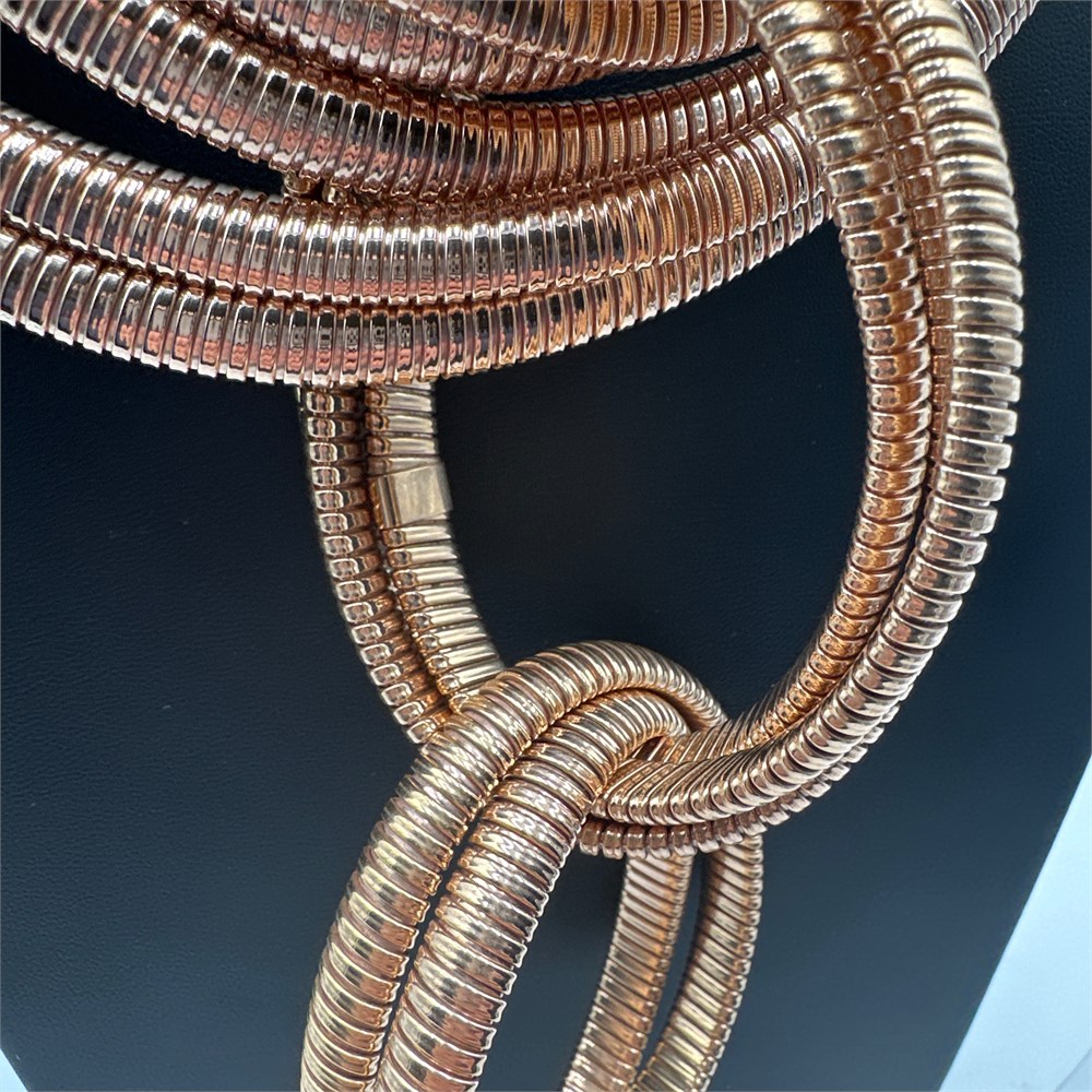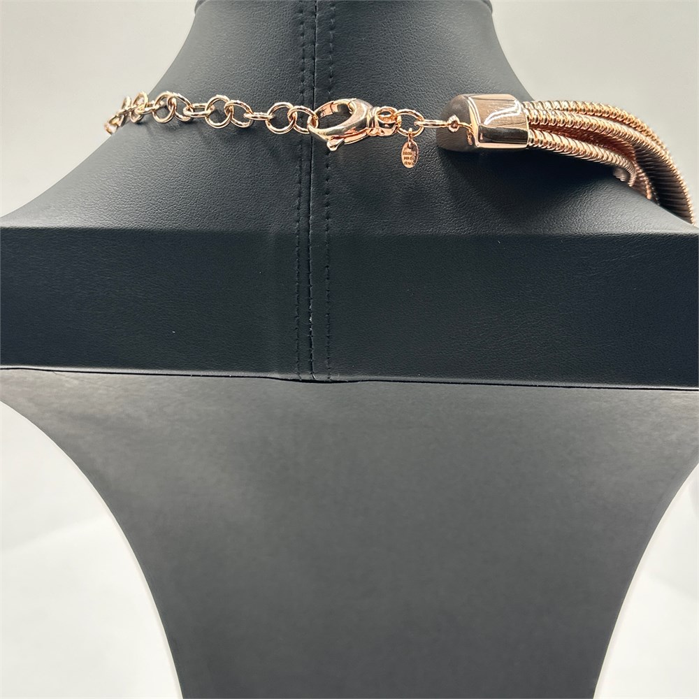 Manufactured by Milor S.p.A. of Milan, Italy, this necklace is from the brand's "Bronzo Italia" collection, widely retailed through QVC. Constructed in solid Italian jewelry-grade bronze with a rose-gold-tone finish, featuring four-strand tubogas (gas pipe) chain construction with a knotted center and triple-strand circular hoop drop. Stamped on oval hangtag "BRONZE / MILOR / ITALY."