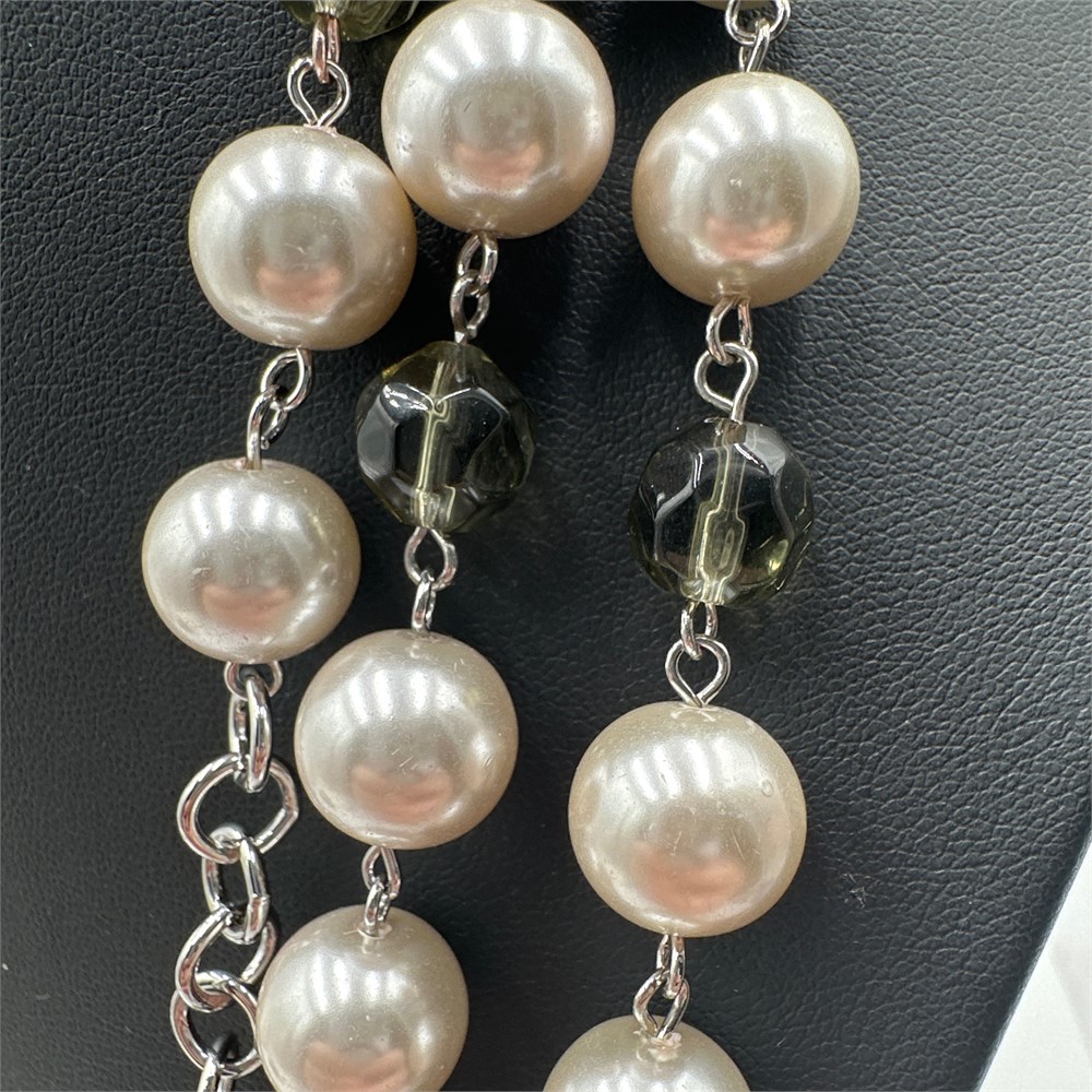 Unsigned costume jewelry sautoir necklace featuring simulated pearls and faceted smoky glass or acrylic beads wire-linked at intervals along silver-tone base metal chain in a multi-strand configuration. Country of origin tag stamped "CHINA" on a round hangtag near the lobster claw clasp; no brand, hallmark, or metal purity marks are present. Detail examination reveals moderate surface wear including scratches and scuffs on the faux pearl coating.