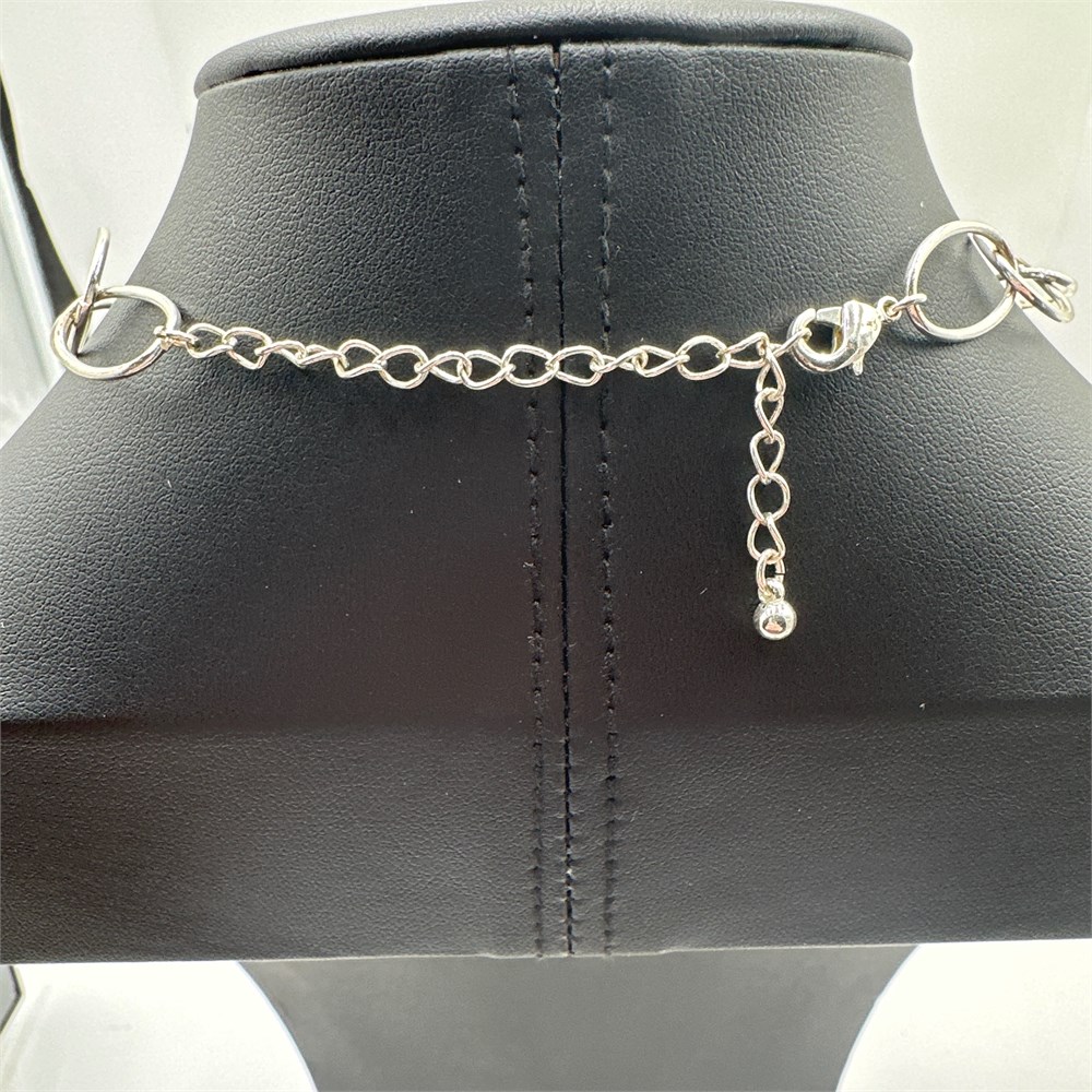 Unmarked silver-plated base metal costume necklace composed of alternating elongated oval and figure-eight (infinity) links, with a lobster claw clasp and extender chain with drop bead. Detail examination reveals plating wear at friction points, exposing a brass or copper-alloy core beneath the silver-tone finish. Construction and hardware are consistent with contemporary mass-produced fashion jewelry, circa 1990s to present.