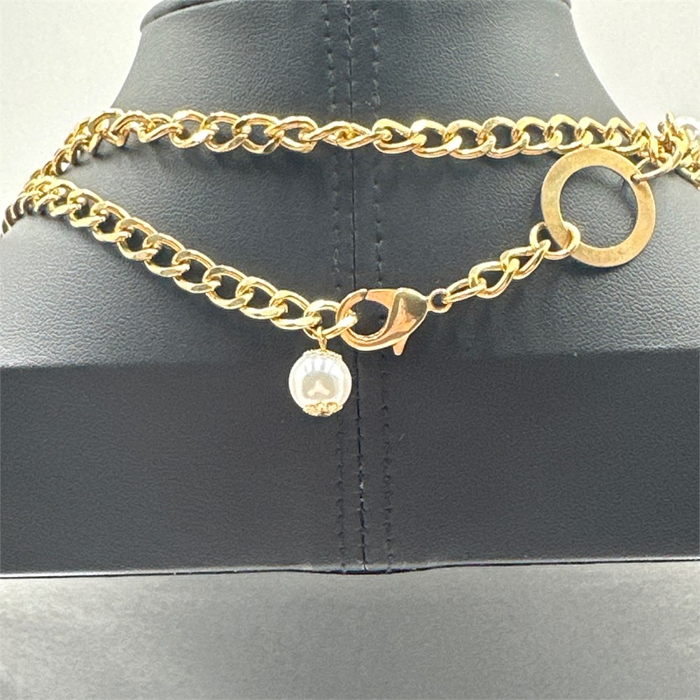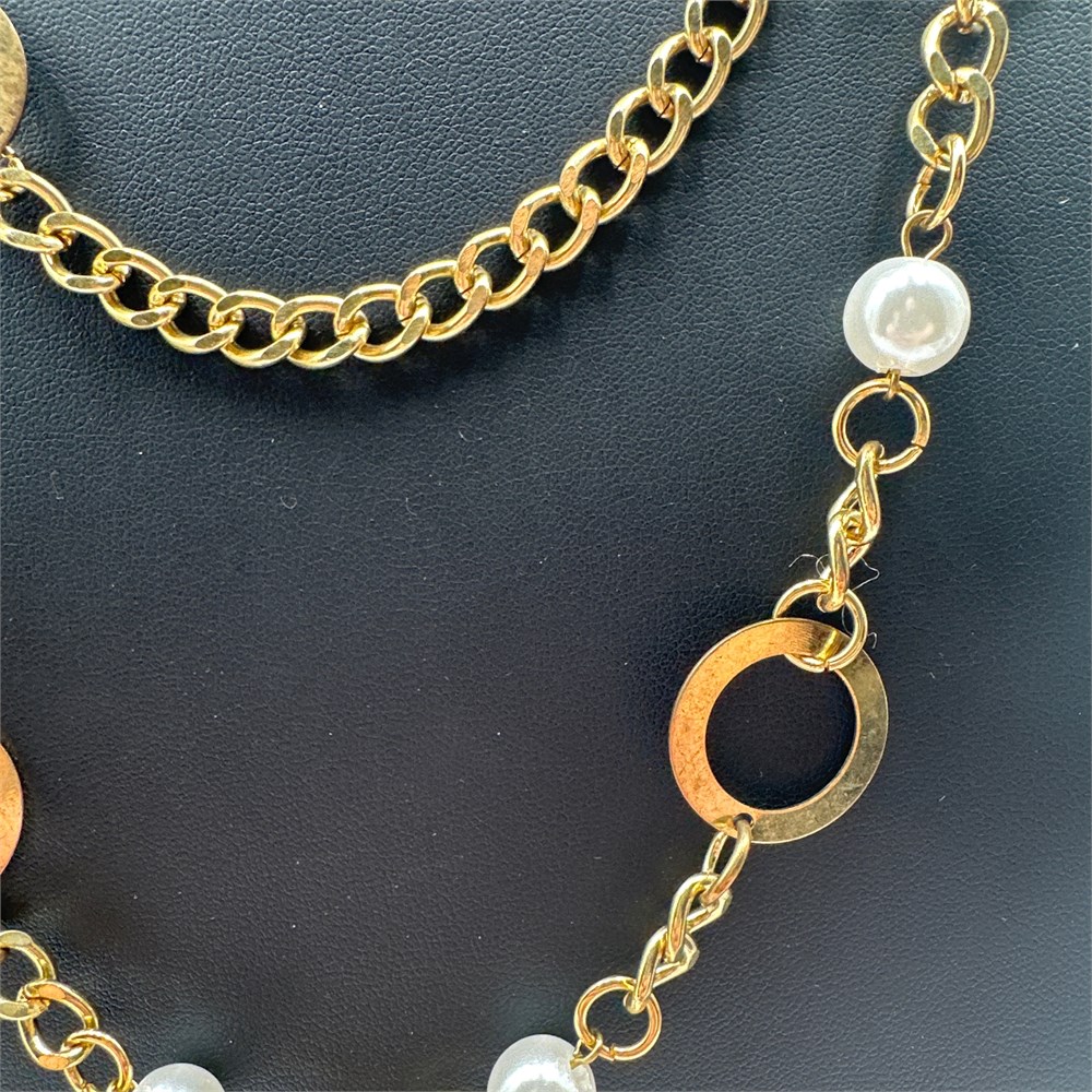 Unmarked gold-tone metal sautoir-length station necklace featuring alternating flat open circular ring stations and faux pearl bead stations connected by curb-style chain links, with a lobster claw clasp closure. Construction and hardware are consistent with contemporary costume jewelry production, dating to the late 20th or early 21st century. Some tarnishing and plating loss is present on several of the flat circular ring elements.