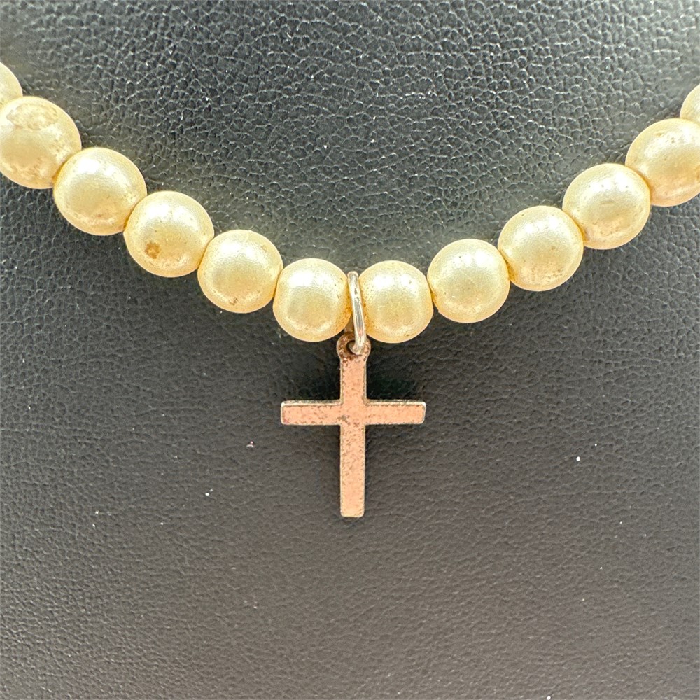 Simulated pearl necklace featuring uniformly sized unnotted faux pearl beads with a spring ring clasp closure, suspending a plain Latin cross pendant in oxidized base metal (likely copper or brass alloy). The beads exhibit loss of faux nacre coating in several areas, revealing the base material beneath, and the cross pendant shows heavy patination consistent with age and wear. Dating to the 20th or 21st century based on hardware style; no maker's marks, hallmarks, or metal purity stamps are present.
