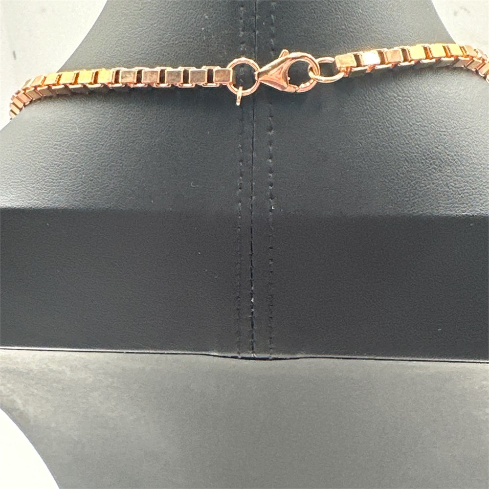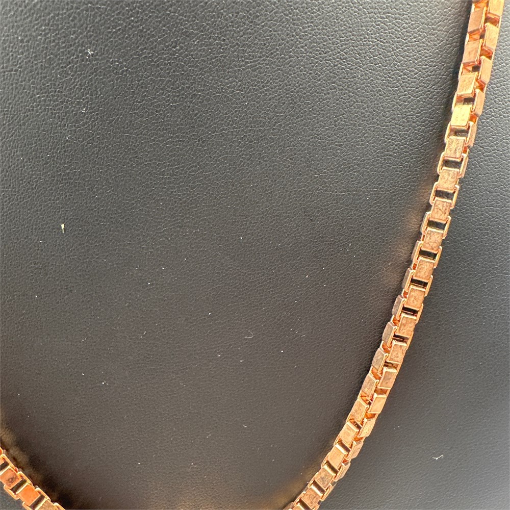 Contemporary machine-made box chain (Venetian link) necklace in a rose gold-tone metal; no visible hallmarks, purity stamps, or maker's marks are present, so metal composition cannot be confirmed as solid gold, gold-filled, or plated. The chain features a standard lobster claw clasp and shows minor surface wear consistent with prior use.