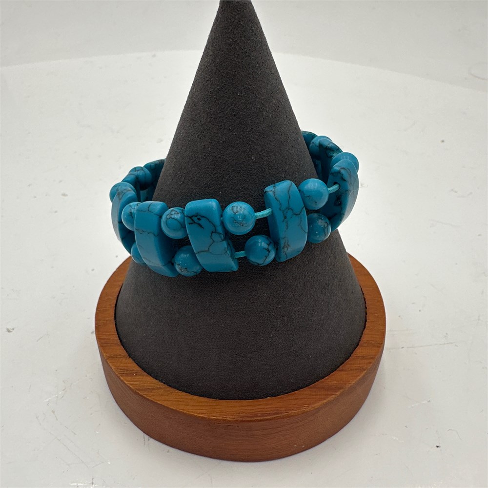 Double-strand elasticated bracelet constructed with alternating curved rectangular slab beads and round spacer beads in simulated turquoise (likely dyed howlite, magnesite, or reconstituted turquoise) with dark matrix veining. Unmarked, mass-produced contemporary Southwestern-style costume jewelry. Strung on elastic cord with no clasp mechanism.