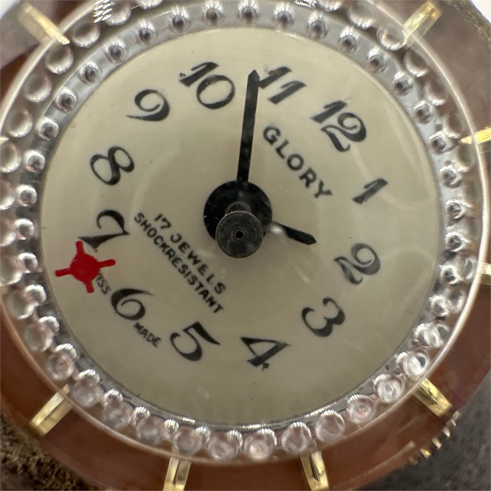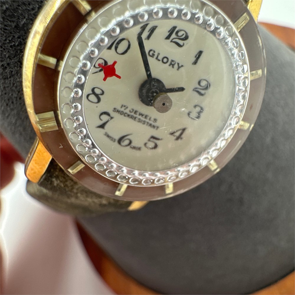 Swiss-made ladies' mechanical wristwatch by Glory, a brand associated with the Basis Watch Co., featuring a 17-jewel shockresistant hand-wound movement and a "mystery dial" with a rotating transparent disc carrying a red four-pointed star as the seconds indicator. Base metal gold-tone case with a domed acrylic crystal; case back stamped "BASE METAL" and "SWISS MADE" with no serial or model numbers present. The gold-tone plating shows significant brassing, the leather strap is heavily worn and degraded, and the crystal exhibits fine surface scratches.
