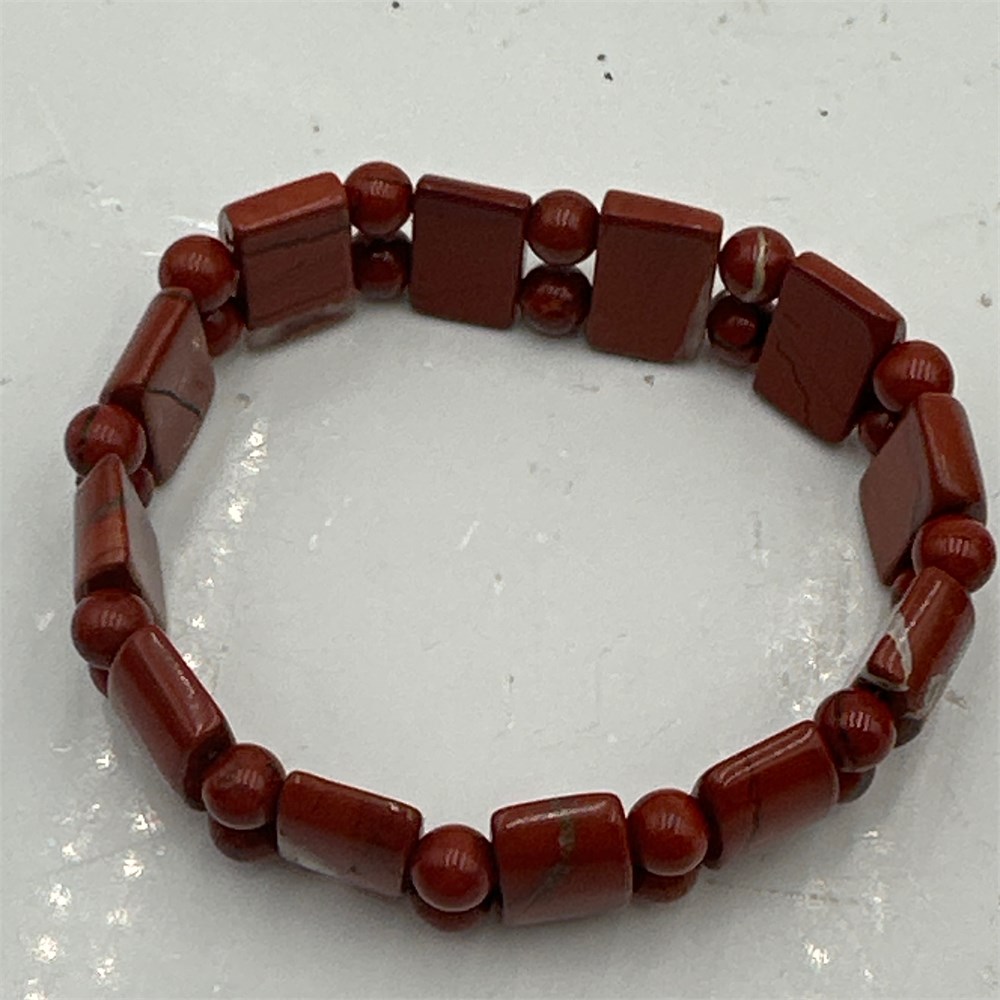 Double-strand stretch bracelet composed of polished, double-drilled domed rectangular Red Jasper tablet beads alternating with stacked spherical Red Jasper spacer beads. The natural stones exhibit characteristic dark veining and one bead features a prominent white quartz inclusion consistent with the mineralogy of the material. Unmarked, with no metal components or clasp.