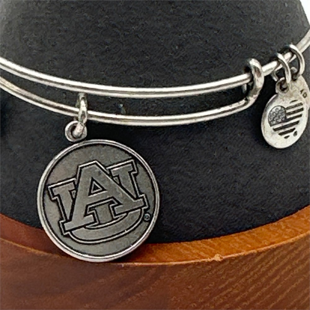 Alex and Ani expandable wire bangle in their proprietary Rafaelian Silver finish (antiqued silver-tone plating over recycled brass base). Features the Auburn University interlocking "AU" logo charm and standard brand signature tags including the Infusion Heart Flag tag. Reverse of charm stamped "ALEX AND ANI®" with ©2017 copyright date, dating manufacture to 2017 or later.