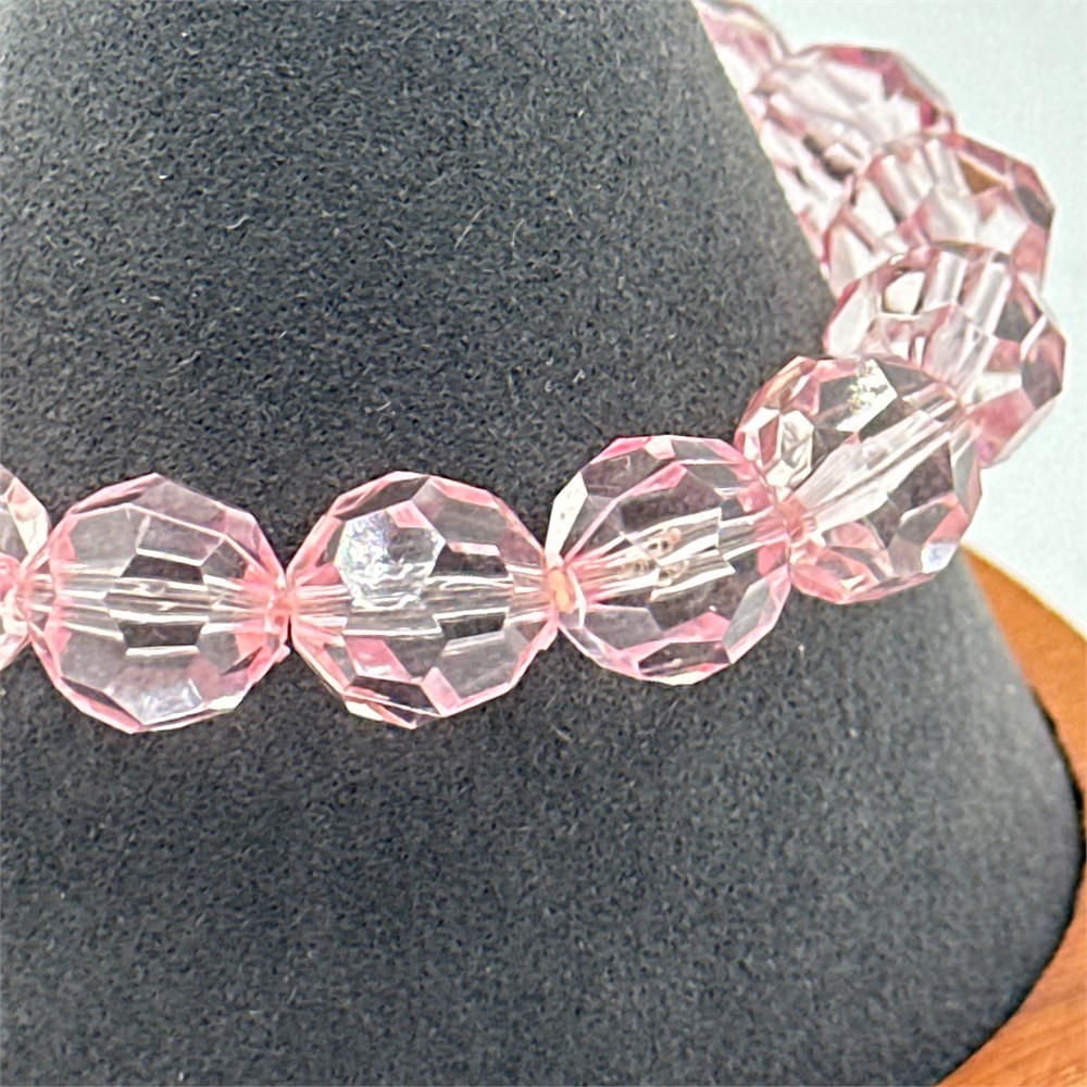 Stretch bracelet composed of faceted pink crystal or glass beads strung on elastic cord. The beads are machine-cut with uniform faceting, consistent with modern production methods.
