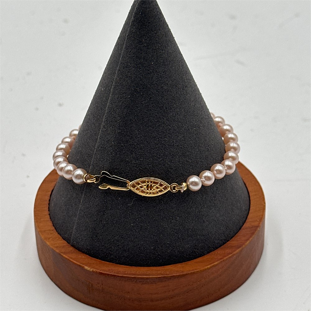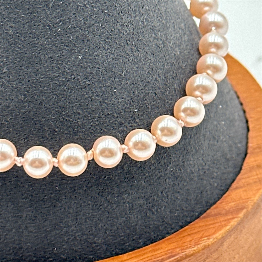 Single-strand necklace of pink-toned pearls, individually hand-knotted on silk thread. Pearls appear to be approximately 8mm in diameter with consistent size and luster throughout the strand.