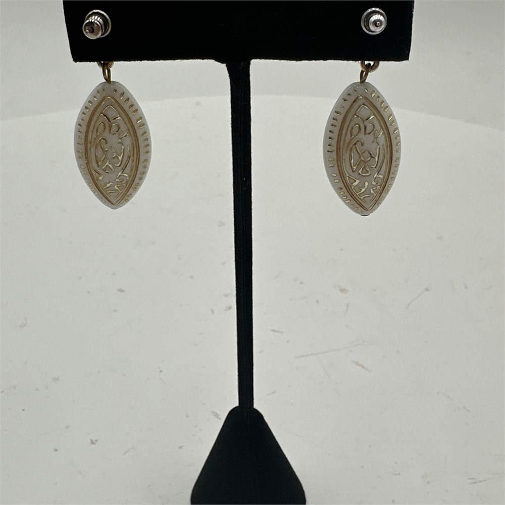 Pair of Carved Celluloid Drop Earrings with Gold-Tone Arabesque Motif View Watchlist >