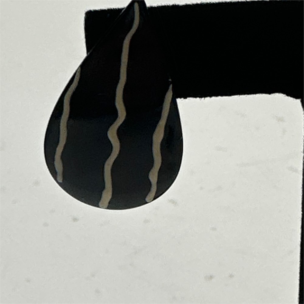 Pair of clip-on earrings in black enamel with cream/ivory wavy line inlay, likely resin or lacquer over metal. Teardrop-shaped form consistent with 1980s costume jewelry design.