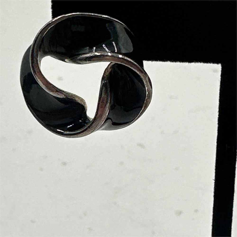 Pair of black enamel knot-form earrings set in a silver-tone metal base. The clip-on backs and enamel work are consistent with costume jewelry production from the mid-to-late 20th century.