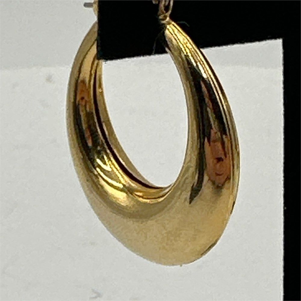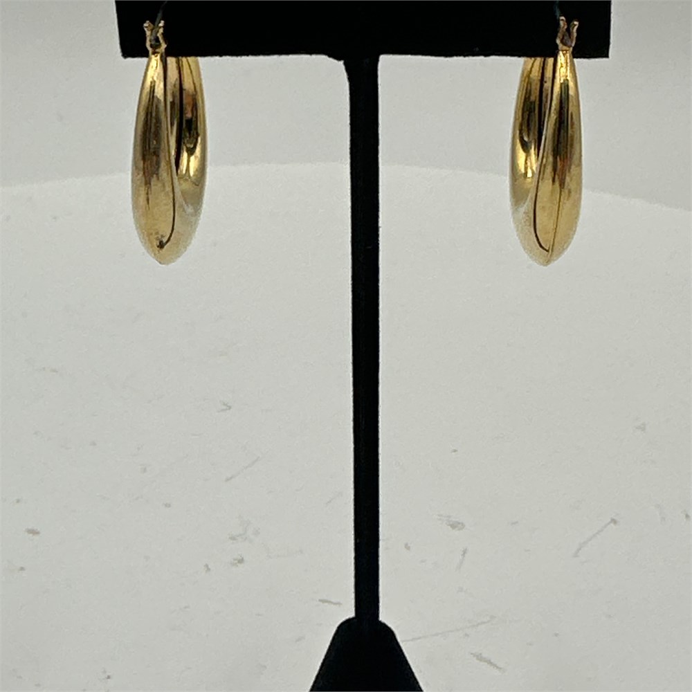 Pair of hollow-form tapered hoop earrings in polished yellow gold, likely 14K, with hinged snap-bar closures for pierced ears. The lightweight hollow construction is consistent with late 20th century machine-produced gold jewelry.