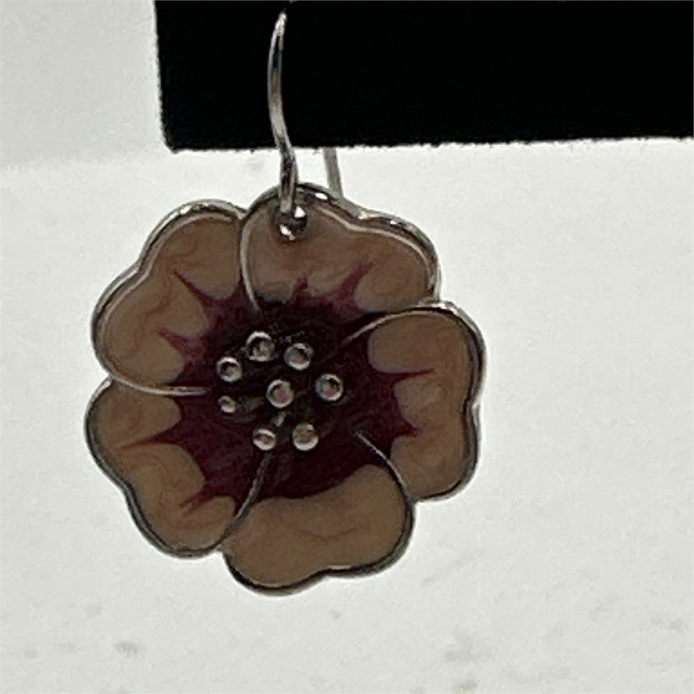 Pair of floral drop earrings featuring cloisonné-style enamel work in pink and burgundy tones set in silver-tone metal with French hook closures. The enamel technique and construction suggest contemporary artisan or costume jewelry production.