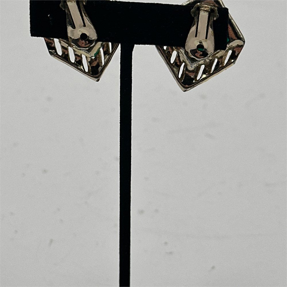Pair of sterling silver clip-on earrings set with square-cut green chrysoprase or green onyx cabochons in pierced gallery settings. The modernist metalwork and construction style suggest mid-20th century production, likely of Mexican or Scandinavian origin.