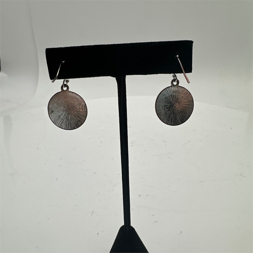 Marked "© AVON" on the reverse, these pierced dangle earrings feature cast base metal disc pendants in an antiqued silver-tone finish with four foil-backed clear glass rhinestones in a cruciform arrangement. The French hook ear wires include small decorative ball beads, and the reverse displays a characteristic radiating sunburst texture common to Avon production. Dating to approximately the 1990s, the design reflects the Brighton-inspired scrollwork aesthetic popular during that period.