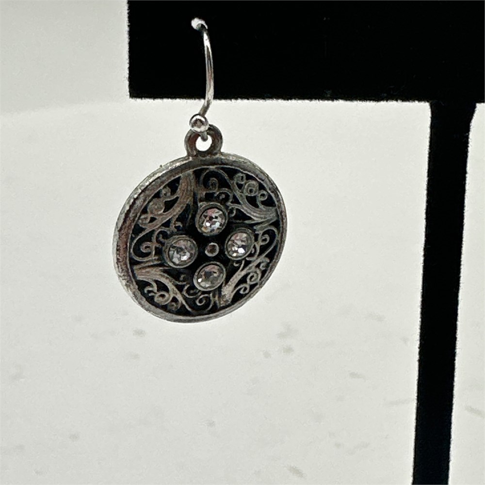 Avon Antiqued Silver-Tone Filigree Scroll Drop Earrings with Clear Rhinestones View Watchlist >