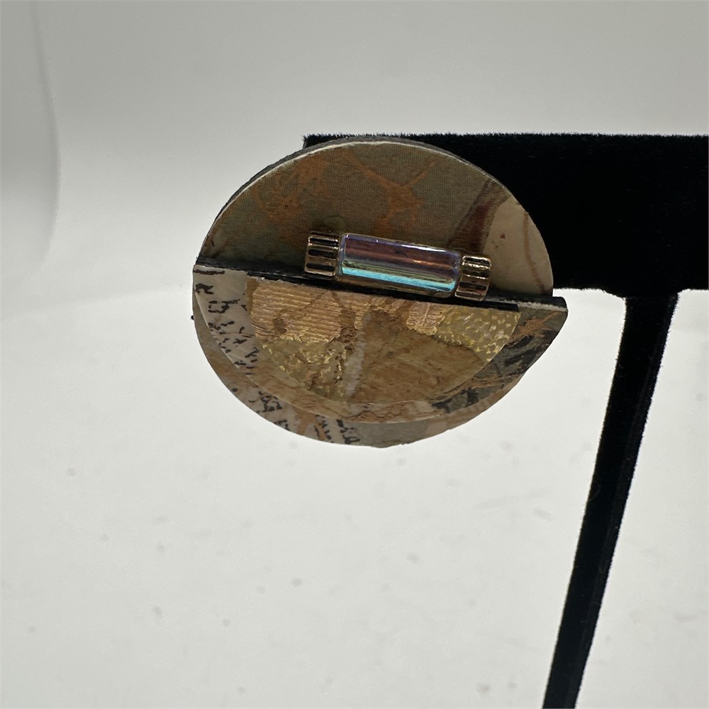 Pair of handcrafted mixed-media pierced stud earrings featuring layered decoupage construction with decorative French manuscript paper, faux gold leaf accents, and a horizontal dichroic glass or aurora borealis bar set in fluted metallic end caps. Earrings have standard friction/butterfly clutch backs and are unsigned with no maker's marks. Consistent with American studio craft jewelry from the late 20th to early 21st century.