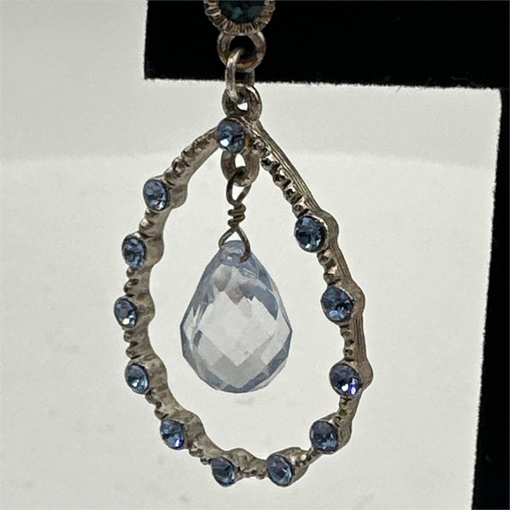 Pair of unmarked costume drop earrings featuring antiqued silver-tone base metal frames cast in an organic twig/branch texture, set with small blue rhinestones and suspended faceted clear/pale blue briolette beads. Construction methods—stones glued into cast recesses without prongs and simple wire-wrapped center drops—indicate modern mass-produced costume jewelry. No maker's marks, hallmarks, or purity stamps are present on any visible surfaces.